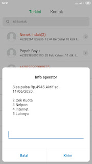 tunggu beberapa saat maka akan ada tampilan pop up tentang sisa pulsa dan masa aktif pulsa nya seperti gambar di bawah ini